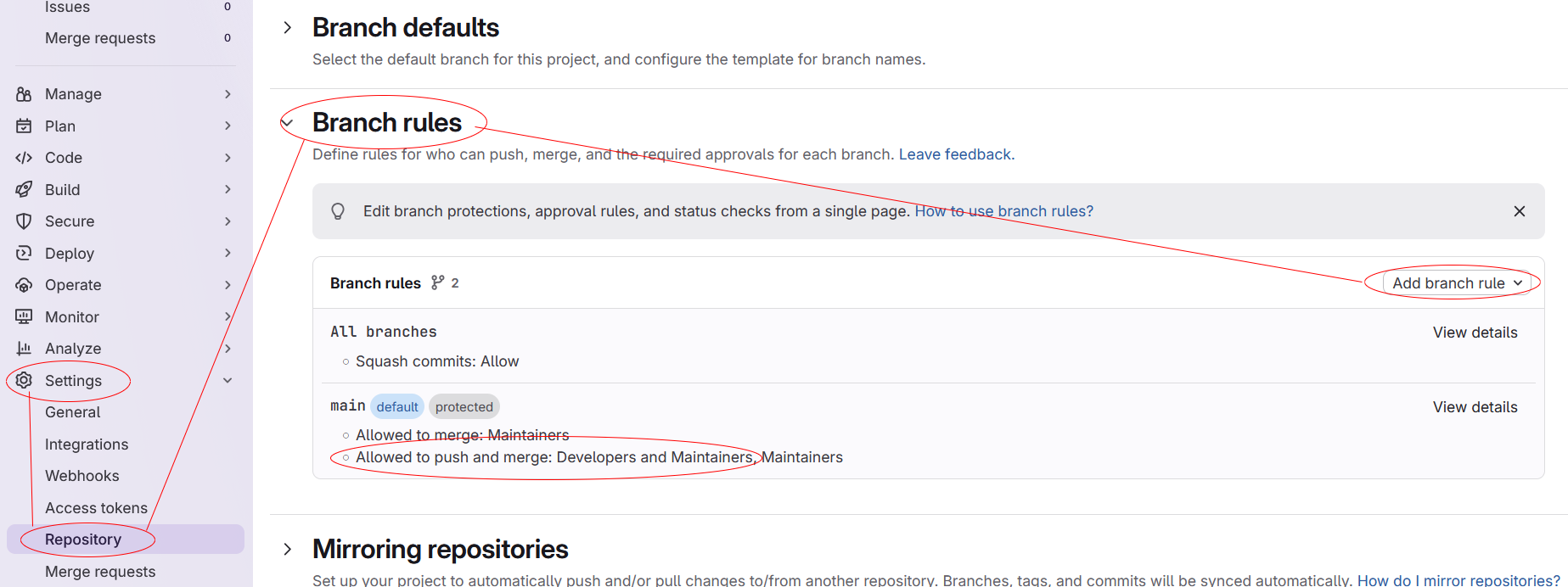 Setting > Repository > Branch rules.